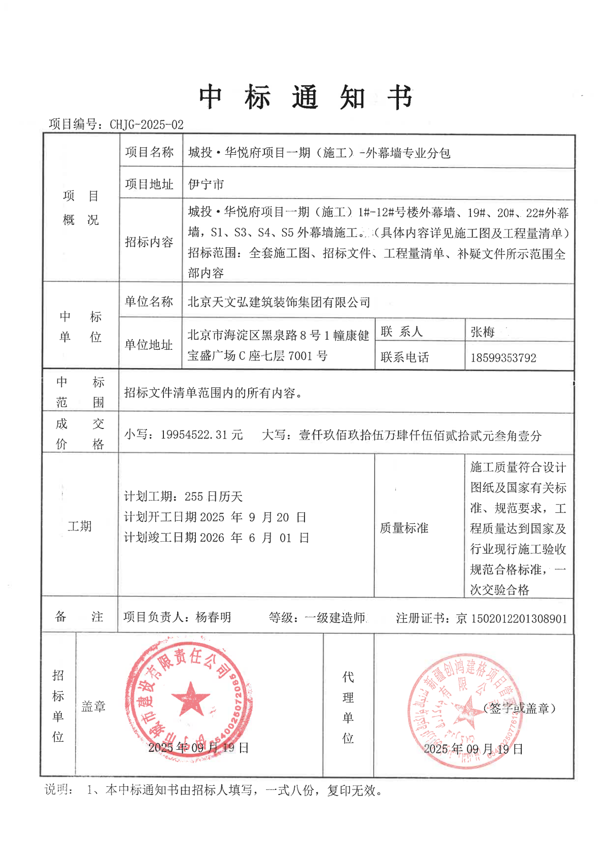 該項目位于新疆伊寧市,中標(biāo)內(nèi)容涵蓋1#-12#號樓、19#、20#、22#樓及商業(yè)配套外幕墻施工,全面覆蓋施工圖及工程量清單要求。工程成交價為1995.45萬元。工程質(zhì)量需嚴(yán)格按國家規(guī)范施工,一次交驗合格,確保工程品質(zhì)與設(shè)計效果高度統(tǒng)一。